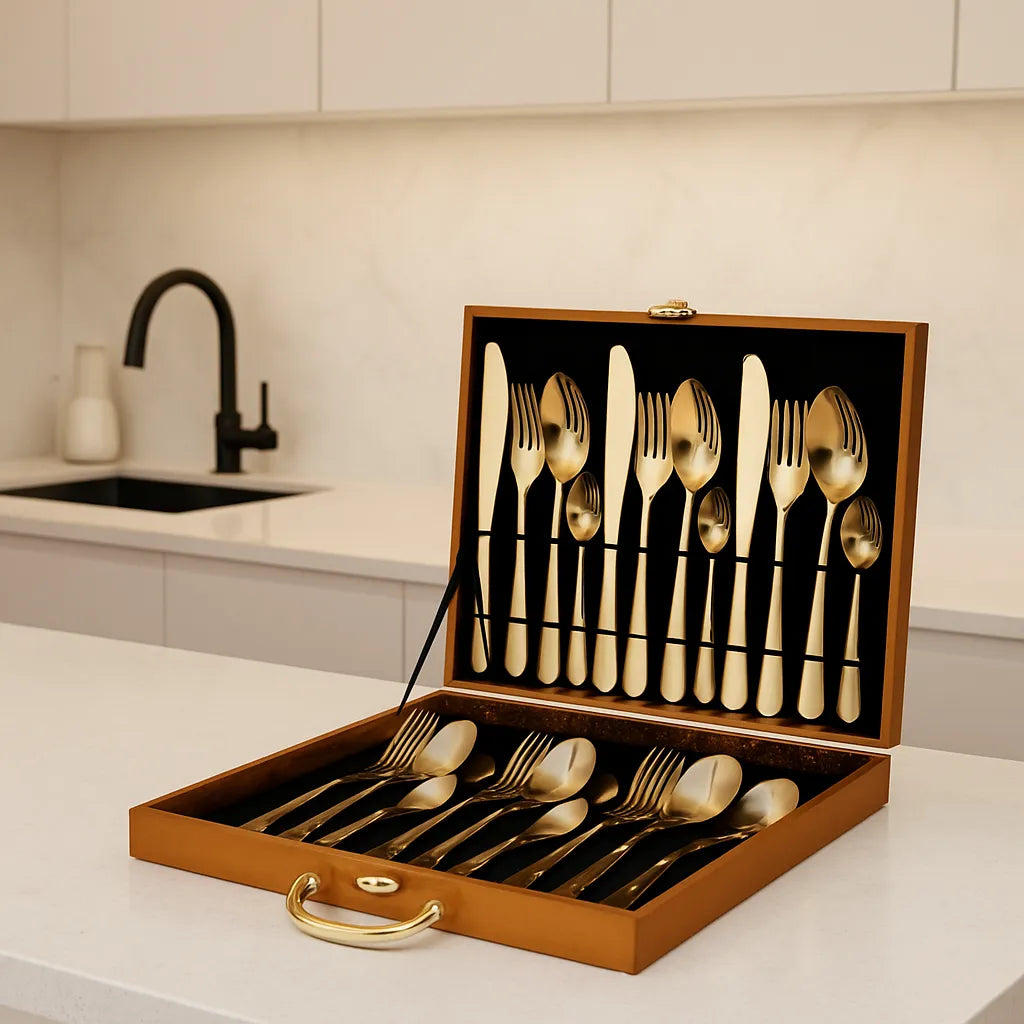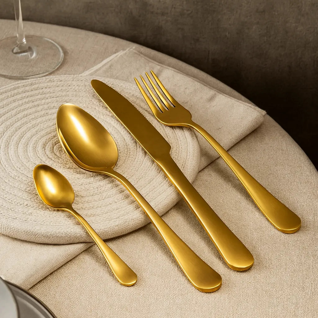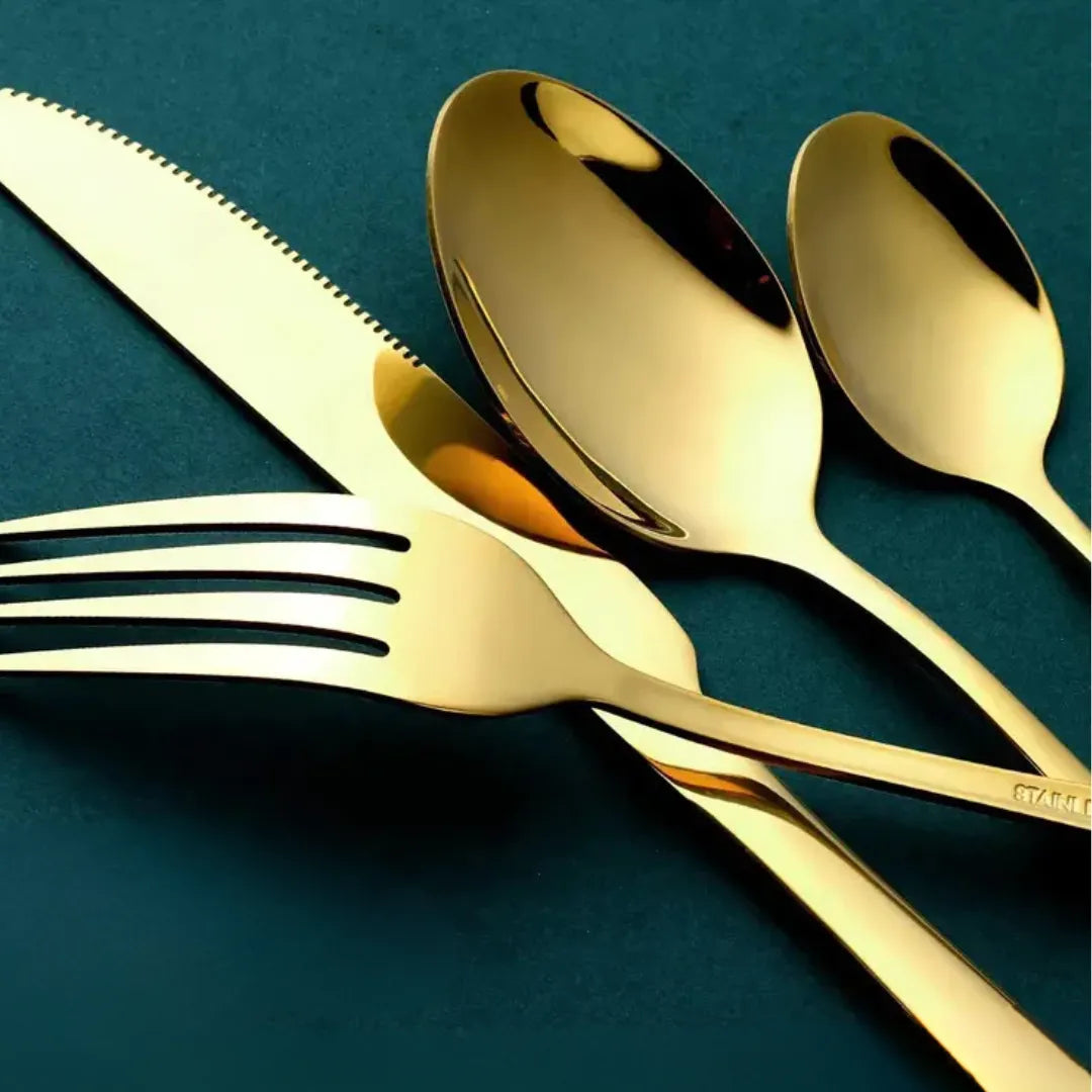 Transforme refeições simples em momentos especiais com o Jogo de Talheres Dourado 24 Peças. O acabamento em dourado luxuoso, aliado ao design moderno e sofisticado, impressiona à primeira vista e adiciona um toque de glamour à sua mesa posta. Ideal para quem ama receber bem, esse faqueiro é mais que um utensílio – é um convite ao bom gosto.