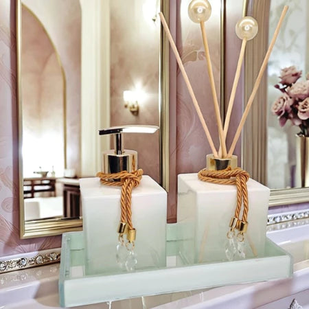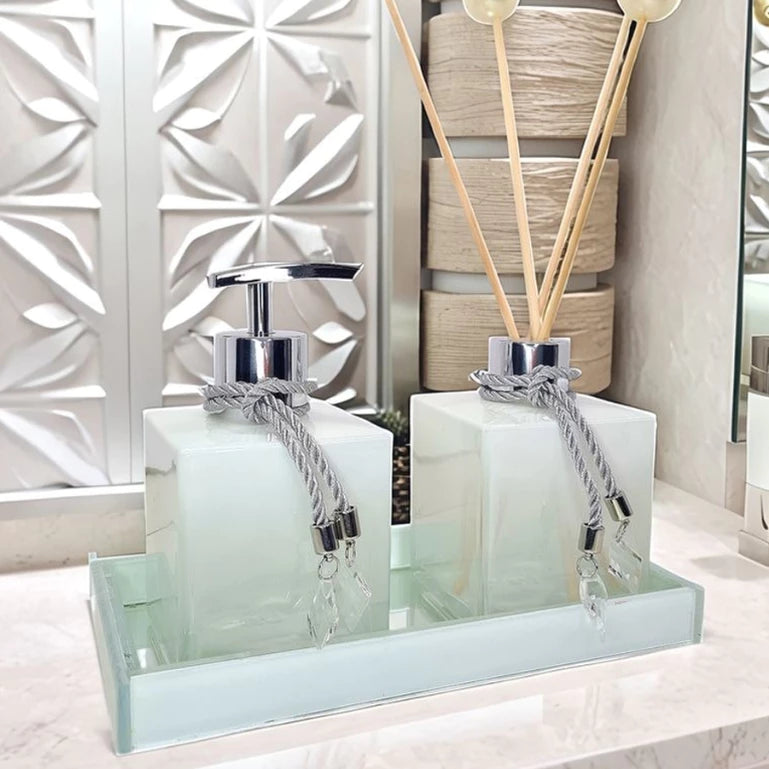 Mais do que utilitários, as peças deste kit são verdadeiros elementos de decoração premium. A transparência do vidro em harmonia com a bandeja branca proporciona leveza e sofisticação, criando um ambiente elegante, organizado e agradável.